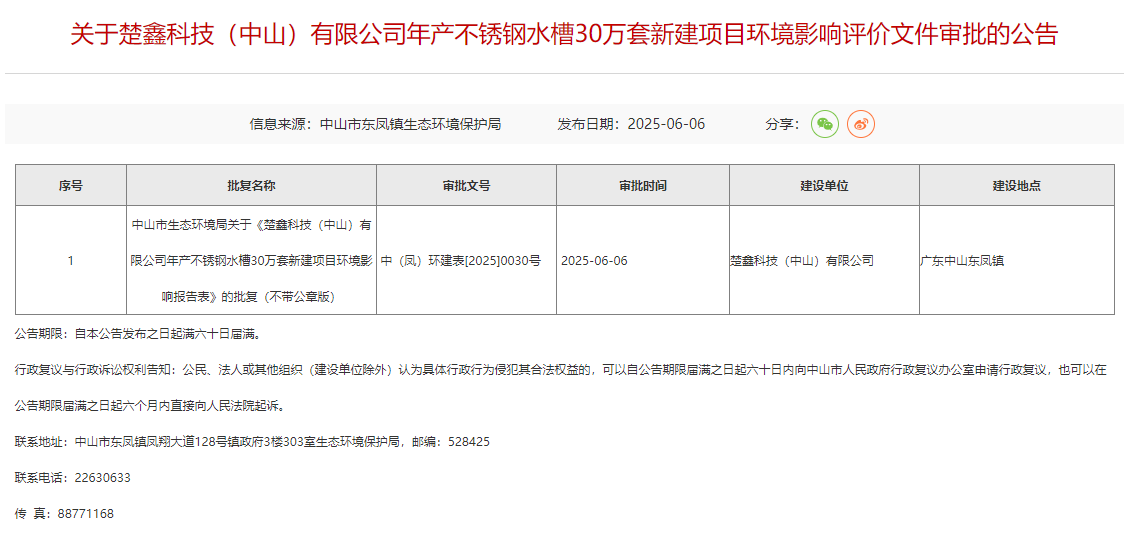2025年6月6日,中山市東鳳鎮(zhèn)生態(tài)環(huán)境保護(hù)局就楚鑫科技(中山)有限公司年產(chǎn)不銹鋼水槽30萬套新建項(xiàng)目環(huán)境影響報(bào)告表作出批復(fù)意見并對外進(jìn)行公告,公告期限:自本公告發(fā)布之日起滿六十日屆滿。