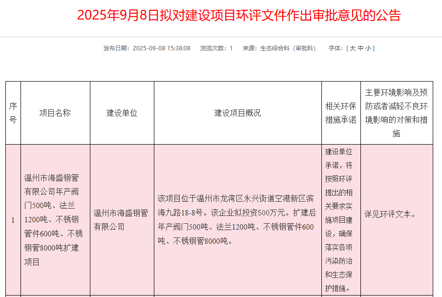 2025年9月8日,溫州市生態(tài)環(huán)境局龍灣分局就溫州市海盛鋼管有限公司年產(chǎn)閥門500噸、法蘭1200噸、不銹鋼管件600噸、不銹鋼管8000噸擴(kuò)建項(xiàng)目環(huán)境影響評(píng)價(jià)報(bào)告表作出審批意見并對(duì)外進(jìn)行公告,公告期:5個(gè)工作日。