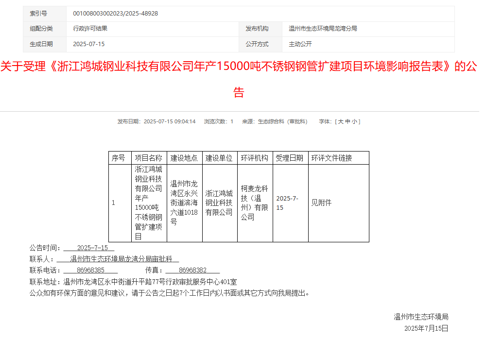 2025年7月15日,溫州市生態(tài)環(huán)境局受理浙江鴻城鋼業(yè)科技有限公司年產15000噸不銹鋼鋼管擴建項目環(huán)境影響報告表并對外進行公告,公告期:7個工作日。